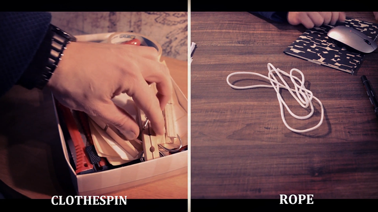 The box is thrown down by holding the end of the string and at the end the signed card will come out of the box remaining in the grip of the clothespin, while the deck is still sealed.