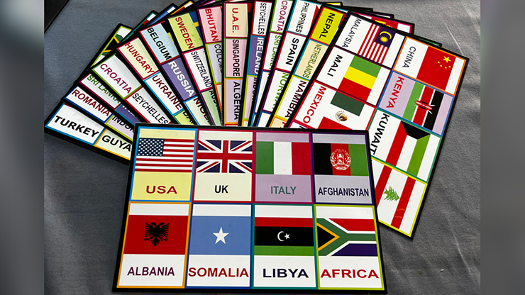 8 cards are displayed. Each card has pictures of 8 different national flags. Out of 64 different flags, the spectator is asked to remember any flag. Performer reveals the spectator's selection within no time!