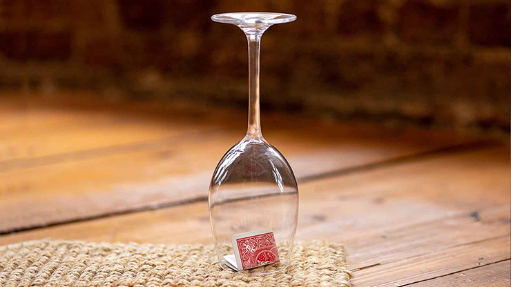 A folded card, that has been trapped under an inverted clear wine glass in full view, is shown to be a card named by a spectator.