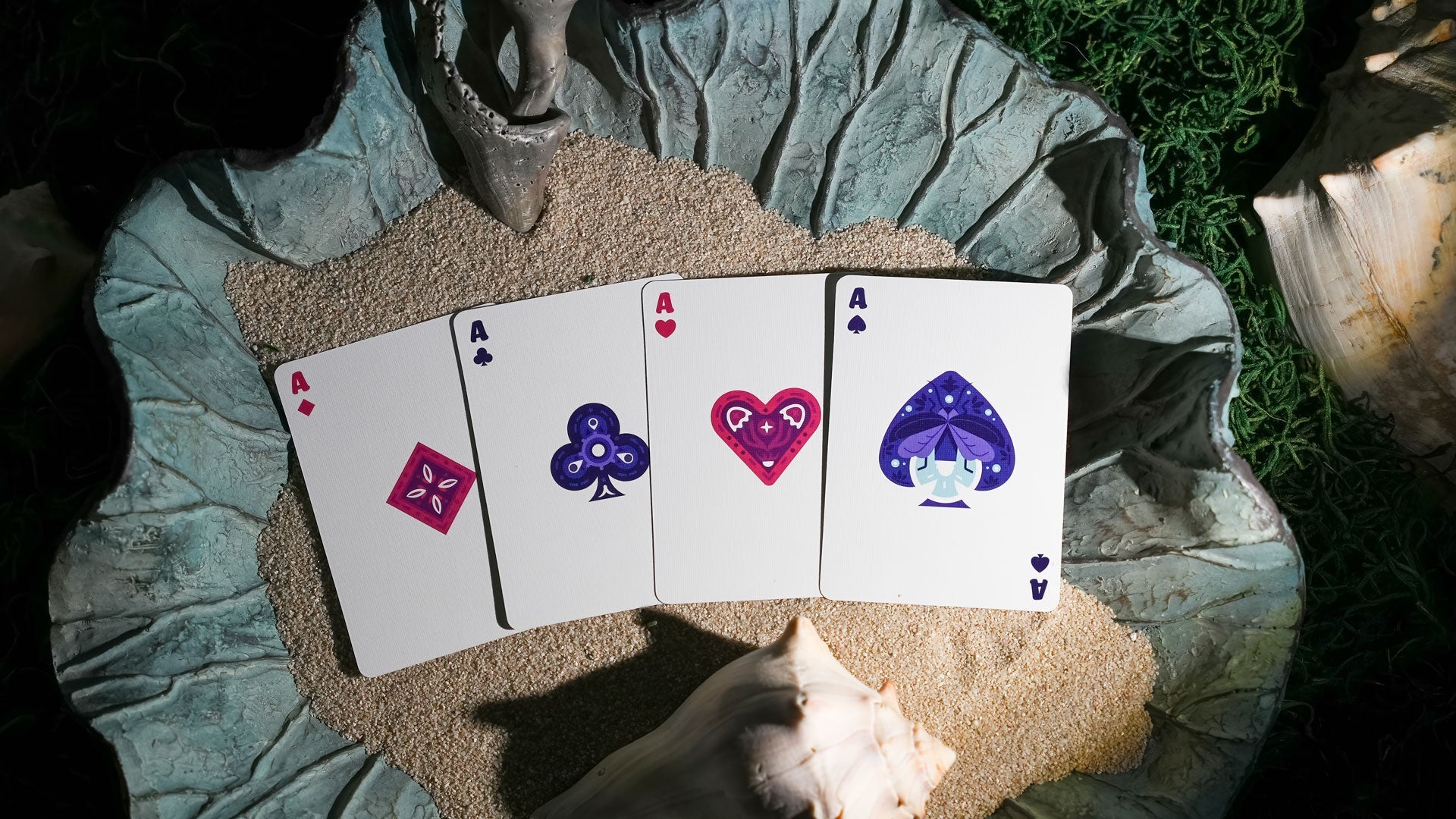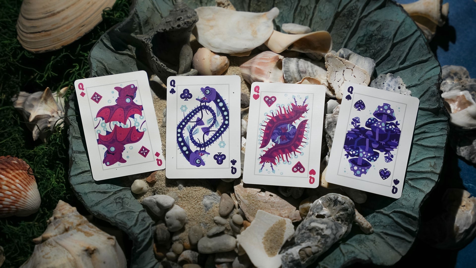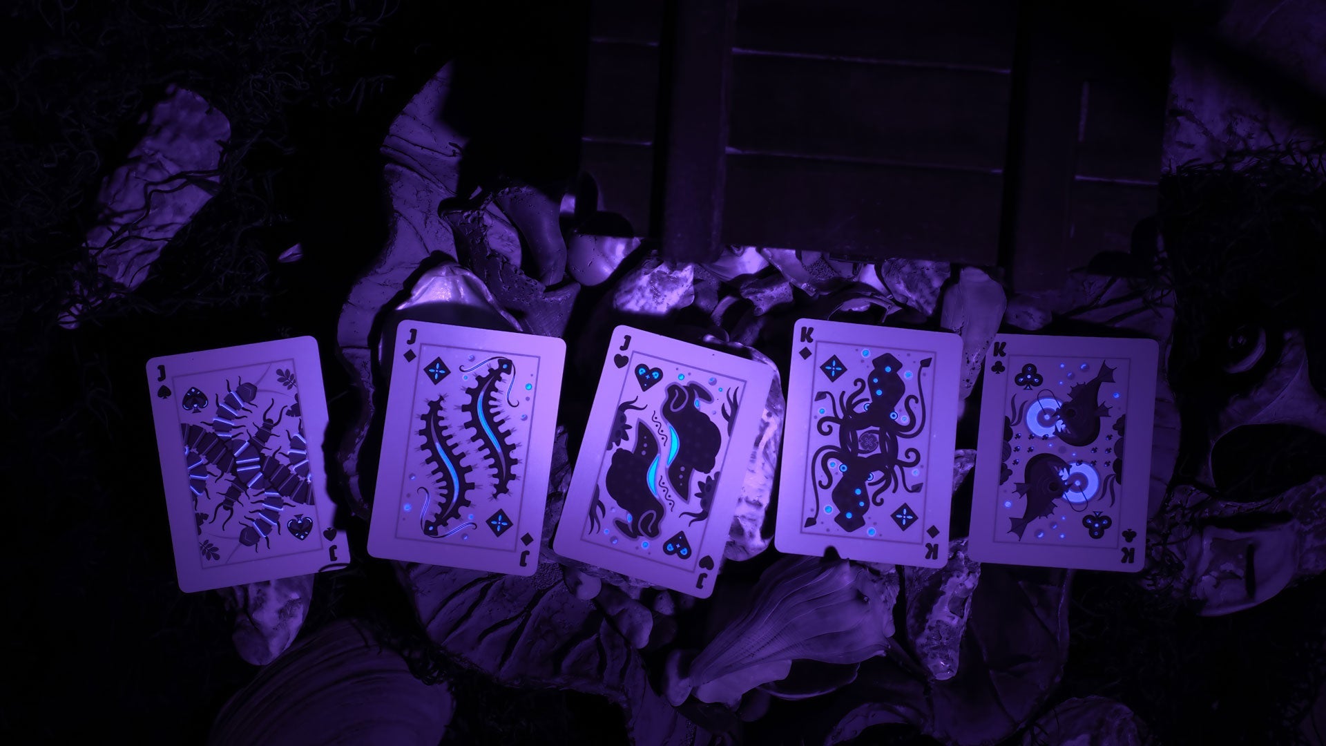 Designed by Douglas Fuchs, the Bioluminescent deck has 100% custom artwork featuring sea creatures, insects, fungi, and more. All of the art of the backs, faces, and the tuck box are accented by special UV ink that glows under a blacklight*.