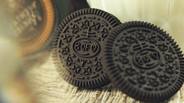 You take an Oreo out of a brand new package and hand it to a spectator and instruct them to take a picture with it. When this picture is reviewed, the Oreo reveals their selected playing card. In real life, the Oreo is a totally normal cookie they can eat.