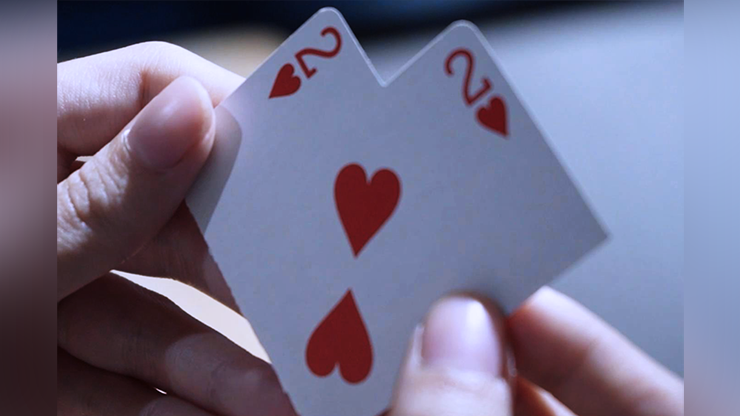 Magician shows a two of hearts to the audience, rips it from the middle, then staggers the two pieces together.